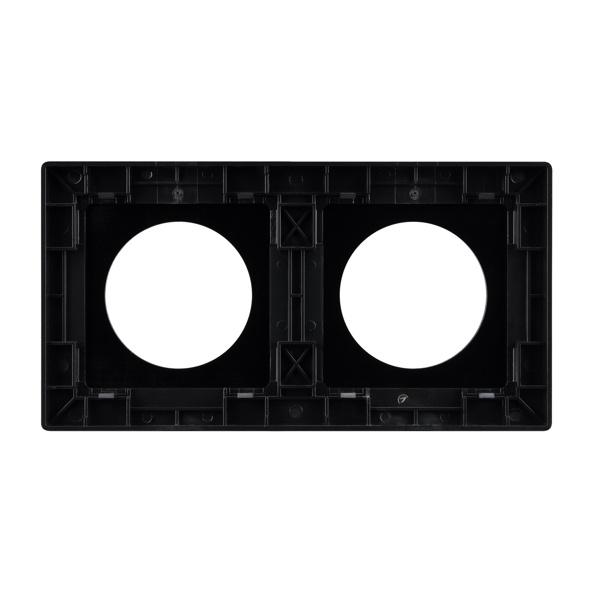 Рамка алюминиевая на 2 поста, под встраиваемый механизм. Вырез под функциональную часть - круг. Цвет - черный. Ориентации монтажа - горизонтальная и вертикальная.